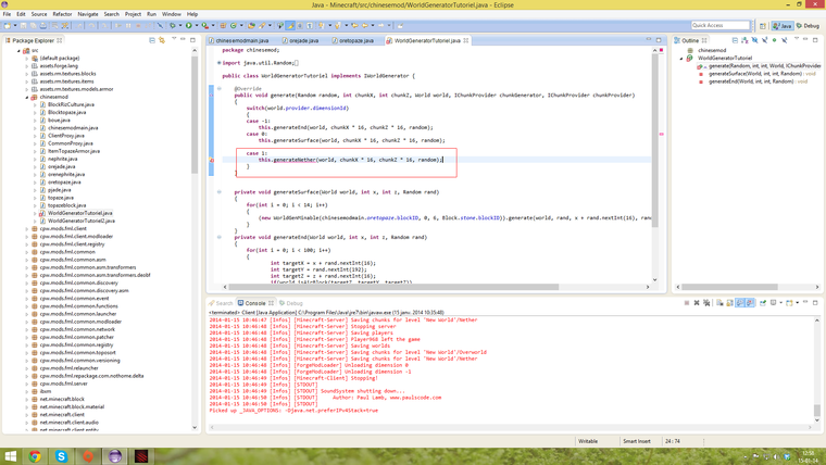 switch(world.provider.dimensionId) { case -1: this.generateNether(world, chunkX * 16, chunkZ * 16, random); case 0: this.generateSurface(world, chunkX * 16, chunkZ * 16, random); case 1: this.generateEnd(world, chunkX * 16, chunkZ * 16, random); }Ensuite pour la génération seulement en surface, le problème du code que je t’ai donné, c’est qu’il va que générer si le random tombe sur un cas où le bloc juste au dessus est de l’air, ce qui est très rare.