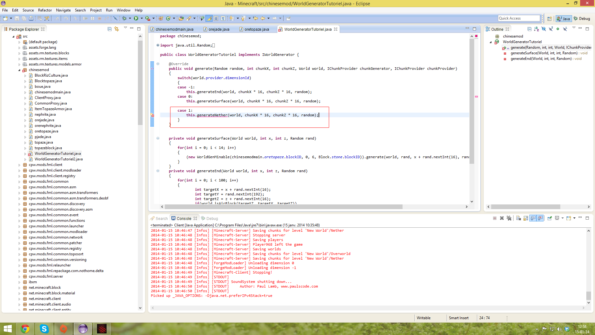 package Mineralherb; import java.util.Random; import net.minecraft.block.Block; import net.minecraft.util.MathHelper; import net.minecraft.world.World; import net.minecraft.world.chunk.IChunkProvider; import net.minecraft.world.gen.feature.WorldGenMinable; import cpw.mods.fml.common.IWorldGenerator; public abstract class WorldGeneratorMineral implements IWorldGenerator { private int minableBlockId; private int minableBlockMeta; private double numberOfBlocks; public boolean generate(World par1World, Random par2Random, int par3, int par4, int par5) { float f = par2Random.nextFloat() * (float)Math.PI; double d0 = (double)((float)(par3 + 8) + MathHelper.sin(f) * (float)this.numberOfBlocks / 8.0F); double d1 = (double)((float)(par3 + 8) - MathHelper.sin(f) * (float)this.numberOfBlocks / 8.0F); double d2 = (double)((float)(par5 + 8) + MathHelper.cos(f) * (float)this.numberOfBlocks / 8.0F); double d3 = (double)((float)(par5 + 8) - MathHelper.cos(f) * (float)this.numberOfBlocks / 8.0F); double d4 = (double)(par4 + par2Random.nextInt(3) - 2); double d5 = (double)(par4 + par2Random.nextInt(3) - 2); for (int l = 0; l <= this.numberOfBlocks; ++l) { double d6 = d0 + (d1 - d0) * (double)l / (double)this.numberOfBlocks; double d7 = d4 + (d5 - d4) * (double)l / (double)this.numberOfBlocks; double d8 = d2 + (d3 - d2) * (double)l / (double)this.numberOfBlocks; double d9 = par2Random.nextDouble() * (double)this.numberOfBlocks / 16.0D; double d10 = (double)(MathHelper.sin((float)l * (float)Math.PI / (float)this.numberOfBlocks) + 1.0F) * d9 + 1.0D; double d11 = (double)(MathHelper.sin((float)l * (float)Math.PI / (float)this.numberOfBlocks) + 1.0F) * d9 + 1.0D; int i1 = MathHelper.floor_double(d6 - d10 / 2.0D); int j1 = MathHelper.floor_double(d7 - d11 / 2.0D); int k1 = MathHelper.floor_double(d8 - d10 / 2.0D); int l1 = MathHelper.floor_double(d6 + d10 / 2.0D); int i2 = MathHelper.floor_double(d7 + d11 / 2.0D); int j2 = MathHelper.floor_double(d8 + d10 / 2.0D); for (int k2 = i1; k2 <= l1; ++k2) { double d12 = ((double)k2 + 0.5D - d6) / (d10 / 2.0D); if (d12 * d12 < 1.0D) { for (int l2 = j1; l2 <= i2; ++l2) { double d13 = ((double)l2 + 0.5D - d7) / (d11 / 2.0D); if (d12 * d12 + d13 * d13 < 1.0D) { for (int i3 = k1; i3 <= j2; ++i3) { double d14 = ((double)i3 + 0.5D - d8) / (d10 / 2.0D); Block block = Block.blocksList[par1World.getBlockId(k2, l2, i3)]; if (d12 * d12 + d13 * d13 + d14 * d14 < 1.0D && (block != null && block.isGenMineableReplaceable(par1World, k2, l2, i3, this.blockToReplace))) { par1World.setBlock(k2, l2, i3, this.minableBlockId, minableBlockMeta, 2); World.setBlock(k2, l2 + 3, i3, 3005, minableBlockMeta, 2); } } } } } } } return true; } }World.setBlock(k2, l2 + 3, i3, 3005, minableBlockMeta, 2); erreur: Cannot make a static reference to the non-static method setBlock(int, int, int, int, int, int) from the type World