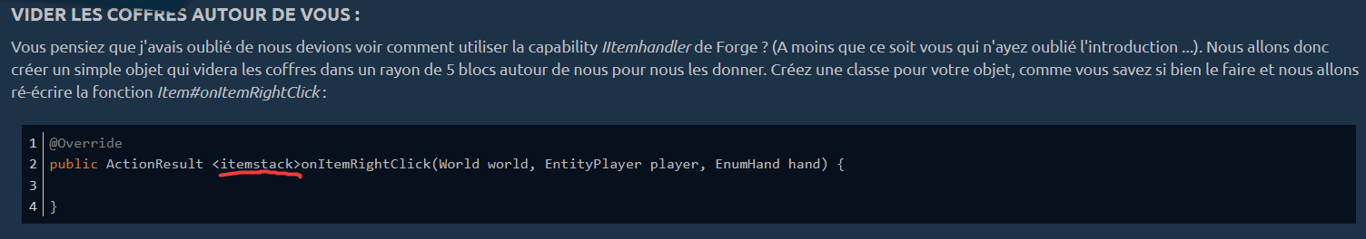Vous pensiez que j’avais oublié de nous devions voir comment utiliser la capability IItemhandler de Forge ? (A moins que ce soit vous qui n’ayez oublié l’introduction …). Nous allons donc créer un simple objet qui videra les coffres dans un rayon de 5 blocs autour de nous pour nous les donner. Créez une classe pour votre objet, comme vous savez si bien le faire et nous allons ré-écrire la fonction Item#onItemRightClick :