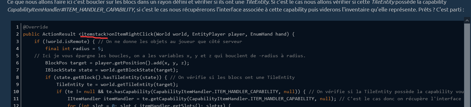 Ce que nous allons faire ici c’est boucler sur les blocs dans un rayon défini et vérifier si ils ont une TileEntity. Si c’est le cas nous allons vérifier si cette TileEntity possède la capability CapabilityItemHandler#ITEM_HANDLER_CAPABILITY, si c’est le cas nous récupérerons l’interface associée à cette capability puis viderons l’inventaire qu’elle représente. Prêts ? C’est parti :