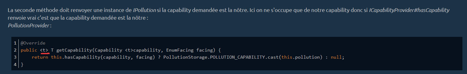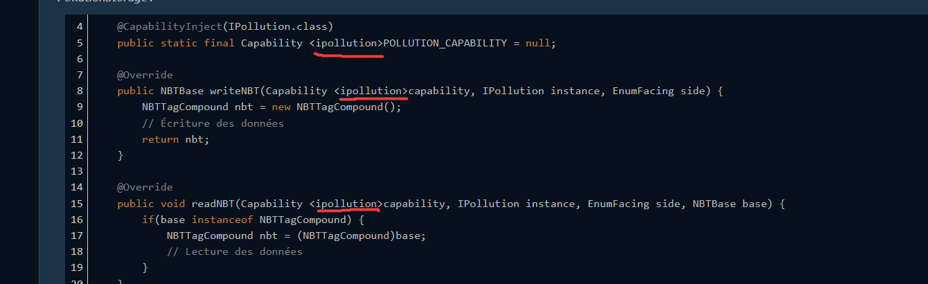 Je ne fais qu’une seule chose dans ce constructeur : initialiser la propriété pollution en lui donnant comme valeur l’implémentation par défaut de la capability. Celle-ci peut-être appelée directement depuis le constructeur new DefaultPollution() ou en passant par la capability PollutionStorage.POLLUTION_CAPABILITY.getDefaultInstance().