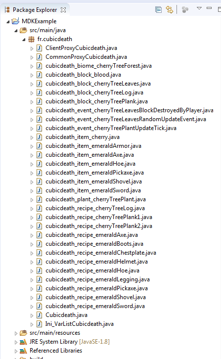 package fr.cubicdeath; import net.minecraftforge.fml.relauncher.Side; import net.minecraftforge.fml.common.registry.GameRegistry; import net.minecraftforge.fml.common.network.NetworkRegistry; import net.minecraftforge.fml.common.network.IGuiHandler; import net.minecraftforge.fml.common.event.FMLServerStartingEvent; import net.minecraftforge.fml.common.event.FMLPreInitializationEvent; import net.minecraftforge.fml.common.event.FMLInitializationEvent; import net.minecraftforge.fml.common.event.FMLPostInitializationEvent; import net.minecraftforge.fml.common.SidedProxy; import net.minecraftforge.fml.common.Mod.Instance; import net.minecraftforge.fml.common.Mod.EventHandler; import net.minecraftforge.fml.common.Mod; import net.minecraftforge.fml.common.IWorldGenerator; import net.minecraftforge.fml.common.IFuelHandler; import net.minecraftforge.client.model.obj.OBJLoader; import net.minecraft.world.gen.IChunkGenerator; import net.minecraft.world.chunk.IChunkProvider; import net.minecraft.world.World; import net.minecraft.item.ItemStack; import net.minecraft.entity.player.EntityPlayer; import java.util.Random; import java.util.List; import java.util.ArrayList; @Mod(modid = Cubicdeath.MODID, version = Cubicdeath.VERSION) public class Cubicdeath implements IFuelHandler, IWorldGenerator { public static final String NAME = "CubicDeath"; public static final String MODID = "cubicdeath"; public static final String VERSION = "Alpha-Build-0.0.1"; @SidedProxy(clientSide = "mod.cubicdeath.Ini_ClientProxyCubicDeath.java", serverSide = "fr.cubicdeath.Ini_CommonProxyCubicdeath.java") public static Ini_CommonProxyCubicdeath proxy; @Instance(MODID) public static Cubicdeath instance; public static final List<ModElement> elements = new ArrayList<>(); @Override public int getBurnTime(ItemStack fuel) { for (ModElement element : elements) { int ret = element.addFuel(fuel); if (ret != 0) return ret; } return 0; } @Override public void generate(final Random random, int chunkX, int chunkZ, final World world, IChunkGenerator chunkGenerator, IChunkProvider chunkProvider) { final int f_chunkX = chunkX * 16; final int f_chunkZ = chunkZ * 16; if (world.provider.getDimension() == -1) elements.forEach(element -> element.generateNether(world, random, f_chunkX, f_chunkZ)); if (world.provider.getDimension() == 0) elements.forEach(element -> element.generateSurface(world, random, f_chunkX, f_chunkZ)); } @Mod.EventHandler public void load(FMLInitializationEvent event) { System.out.println (NAME + ": Phase d'Initialisation en cour !!!"); GameRegistry.registerFuelHandler(this); GameRegistry.registerWorldGenerator(this, 5); NetworkRegistry.INSTANCE.registerGuiHandler(this, new GuiHandler()); elements.forEach(element -> element.load(event)); proxy.registerRenderers(this); } @Mod.EventHandler public void serverLoad(FMLServerStartingEvent event) { elements.forEach(element -> element.serverLoad(event)); } @Mod.EventHandler public void preInit(FMLPreInitializationEvent event) { System.out.println (NAME + ": Phase de Pré-Initialisation en cour !!!"); if (event.getSide() == Side.CLIENT) OBJLoader.INSTANCE.addDomain("Cubicdeath"); elements.forEach(element -> { element.instance = this.instance; element.preInit(event); }); } @Mod.EventHandler public void postInit(FMLPostInitializationEvent event) { System.out.println (NAME + ": Mod CubicDeath chargé !!!"); } public static class GuiHandler implements IGuiHandler { @Override public Object getServerGuiElement(int id, EntityPlayer player, World world, int x, int y, int z) { return null; } @Override public Object getClientGuiElement(int id, EntityPlayer player, World world, int x, int y, int z) { return null; } } static { //Add Items elements.add(new cubicdeath_item_emeraldArmor()); elements.add(new cubicdeath_item_emeraldSword()); elements.add(new cubicdeath_item_emeraldShovel()); elements.add(new cubicdeath_item_emeraldPickaxe()); elements.add(new cubicdeath_item_emeraldAxe()); elements.add(new cubicdeath_item_emeraldHoe()); elements.add(new cubicdeath_item_cherry()); //Add Blocks elements.add(new cubicdeath_block_cherryTreeLog()); elements.add(new cubicdeath_block_cherryTreeLeaves()); elements.add(new cubicdeath_block_cherryTreePlank()); elements.add(new cubicdeath_block_blood()); //Add Plant elements.add(new cubicdeath_plant_cherryTreePlant()); //Add Biomes elements.add(new cubicdeath_biome_cherryTreeForest()); //Add Entities //Add Particles //Add GUI //Add Recipes elements.add(new cubicdeath_recipe_emeraldHelmet()); elements.add(new cubicdeath_recipe_emeraldChestplate()); elements.add(new cubicdeath_recipe_emeraldLegging()); elements.add(new cubicdeath_recipe_emeraldBoots()); elements.add(new cubicdeath_recipe_emeraldSword()); elements.add(new cubicdeath_recipe_emeraldPickaxe()); elements.add(new cubicdeath_recipe_emeraldAxe()); elements.add(new cubicdeath_recipe_emeraldHoe()); elements.add(new cubicdeath_recipe_emeraldShovel()); elements.add(new cubicdeath_recipe_cherryTreeLog()); elements.add(new cubicdeath_recipe_cherryTreePlank1()); elements.add(new cubicdeath_recipe_cherryTreePlank2()); //Add Events elements.add(new cubicdeath_event_cherryTreeLeavesBlockDestroyedByPlayer()); elements.add(new cubicdeath_event_cherryTreeLeavesRandomUpdateEvent()); elements.add(new cubicdeath_event_cherryTreePlantUpdateTick()); //Add Others } public static class ModElement { public static Object instance; public void load(FMLInitializationEvent event) { } public void generateNether(World world, Random random, int chunkX, int chunkZ) { } public void generateSurface(World world, Random random, int chunkX, int chunkZ) { } public void serverLoad(FMLServerStartingEvent event) { } public void preInit(FMLPreInitializationEvent event) { } public void registerRenderers() { } public int addFuel(ItemStack fuel) { return 0; } } }Organisation des Packages :
