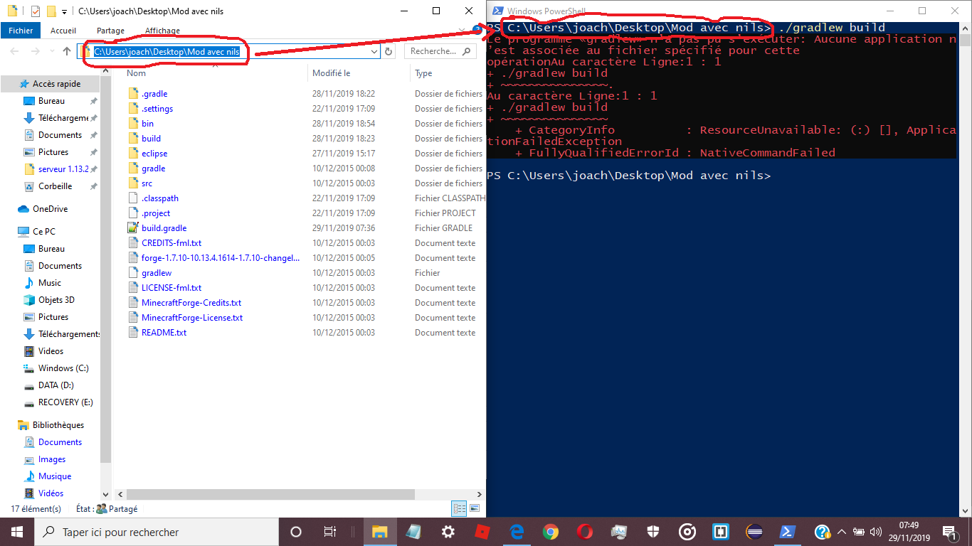 J’execute la commande “.\gradlew build” dans PowerShell et j’obtiens une erreur. La voici :Le programme «gradlew» n’a pas pu s’exécuter: Aucune application n’est associée au fichier spécifié pour cette opération.Au caractère Ligne:1 : 1 + ./gradlew build + ~~~~~~~~~~~~~~~. Au caractère Ligne:1 : 1 + ./gradlew build + ~~~~~~~~~~~~~~~ + CategoryInfo : ResourceUnavailable: (:) [], ApplicationFailedException + FullyQualifiedErrorId : NativeCommandFailedEt quand j’execute la commande “gradlew build” dans cmd j’ai cette erreur: