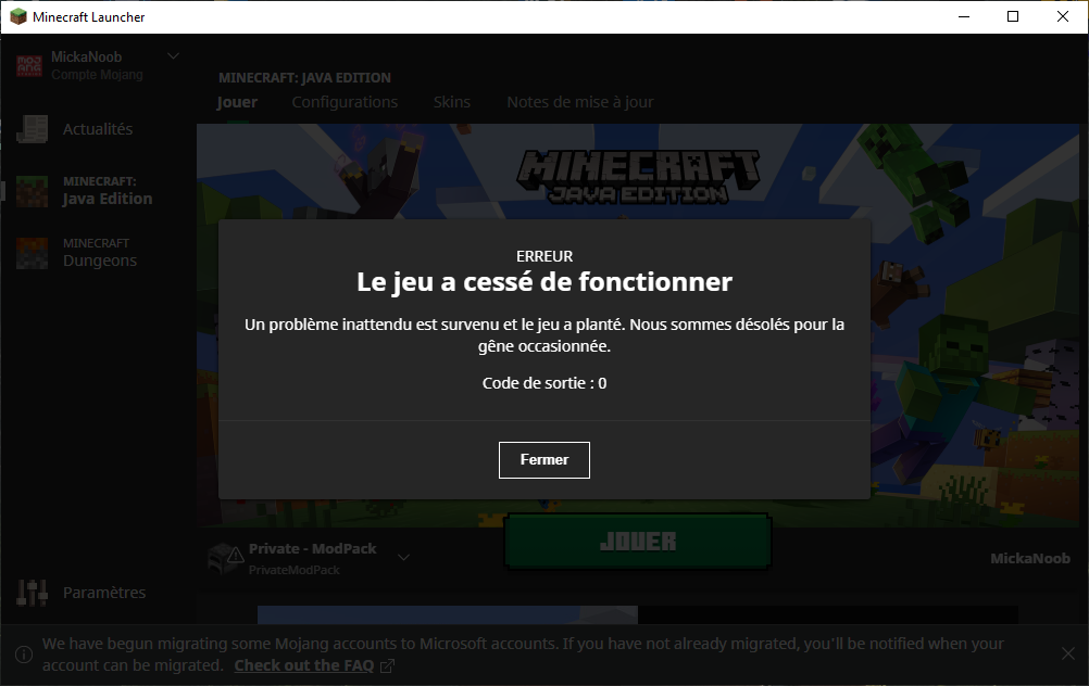 J’ai voulu reprendre un peu en réutilisant mon installeur déjà prog mais le problème c’est que maintenant quand je lance le jeu j’ai un crash sans avoir d’information complémentaire.