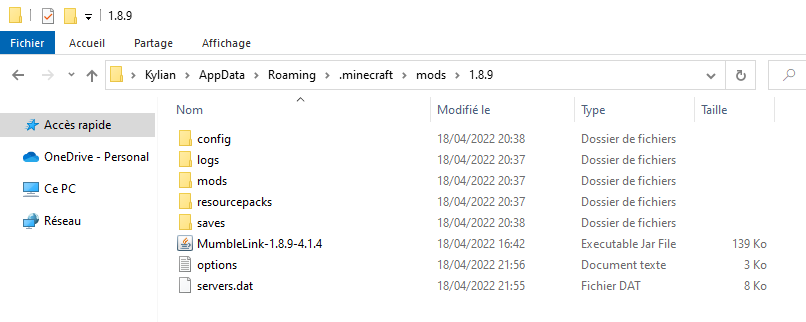 Mon fichier cherche en effet ici: C:\Users\Kylian\AppData\Roaming.minecraft\mods\1.8.9\mods